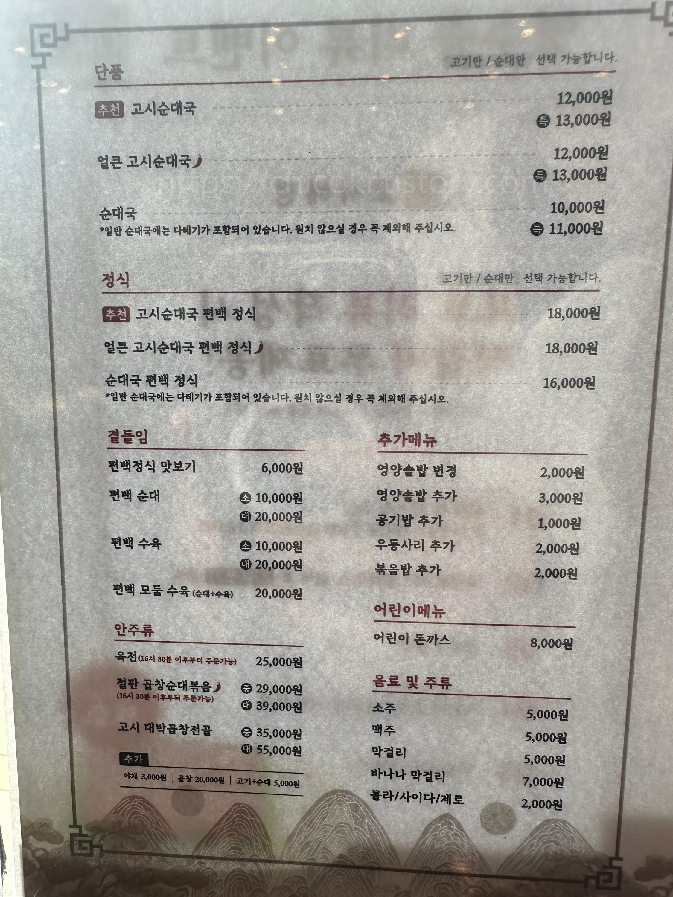 대표 메뉴인 고시순댓국과, 일반 순댓국도 있었고, 여러 가지 곁들임 메뉴 및 정식도 있었어요.